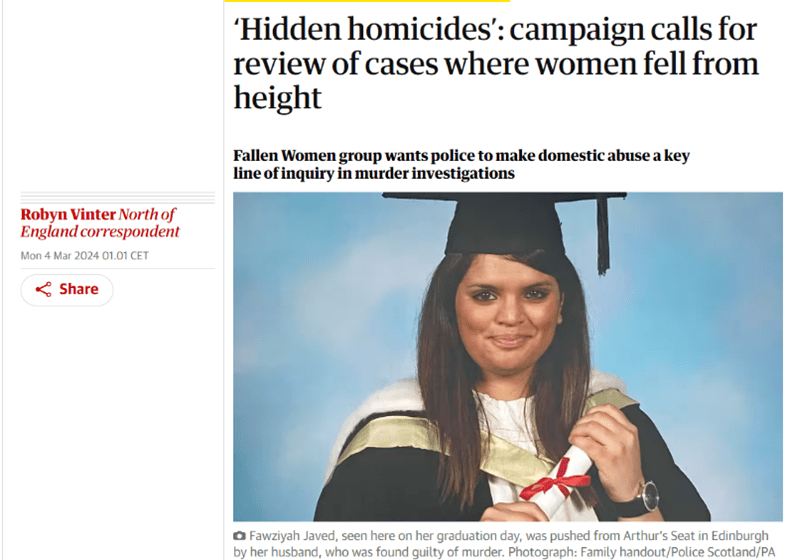 «Homicidios ocultos»: la campaña pide que se revisen los casos de mujeres que cayeron de altura. El grupo FALLEN WOMEN GROUP (grupo por las mujeres caídas) quiere que la policía haga del maltrato doméstico una línea de investigación clave en las investigaciones de asesinatos.