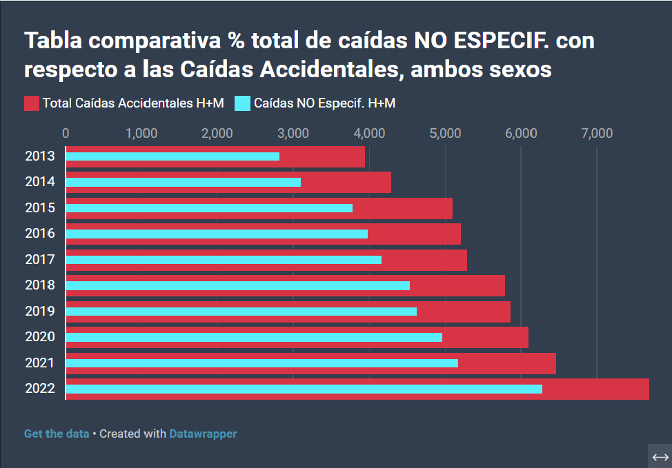 Más preocupante es cuando se hace una comparativa entre las caídas sin especificar y las caídas accidentales. Observar la gráfica y sacar vuestras propias conclusiones.