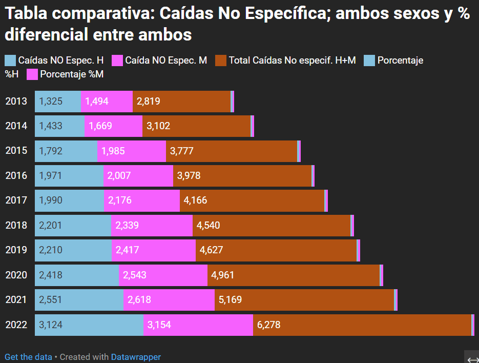 La verdad es que no se aprecia mucho en la misma. Sin embargo, vamos a echarle un vistazo a la tabla comparativa entre Caídas no especificadas en ambos sexos y el % de diferencia entre ambos.