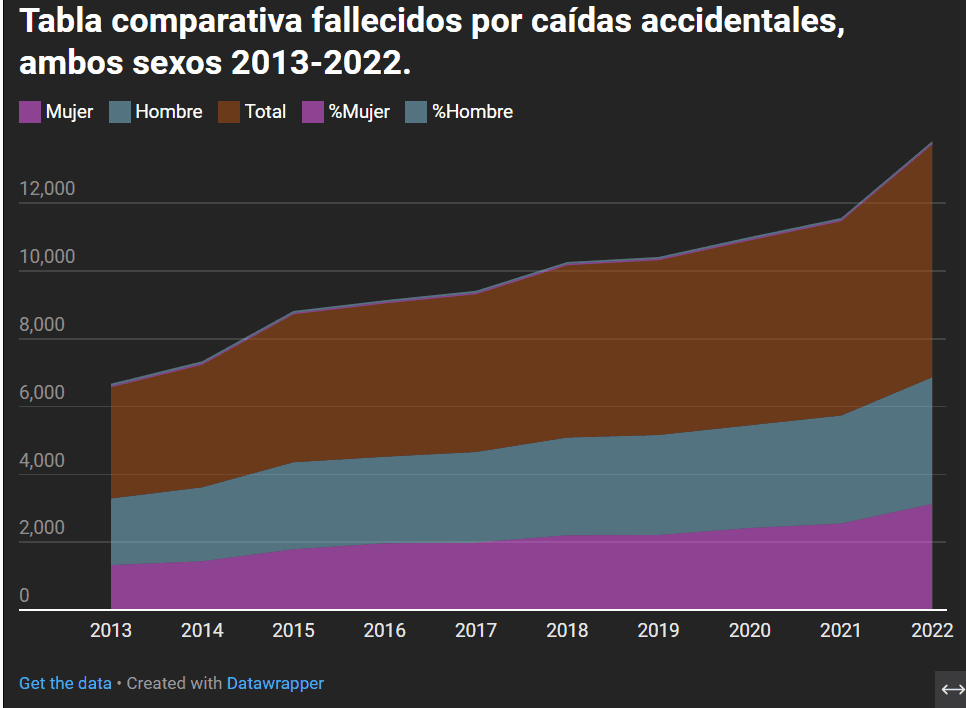 La previsión para este 2023 es la de un aumento hasta el 84% del total de personas fallecidas por este tipo de caída accidental no específica. Quedando repartido de manera equitativa entre ambos sexos.