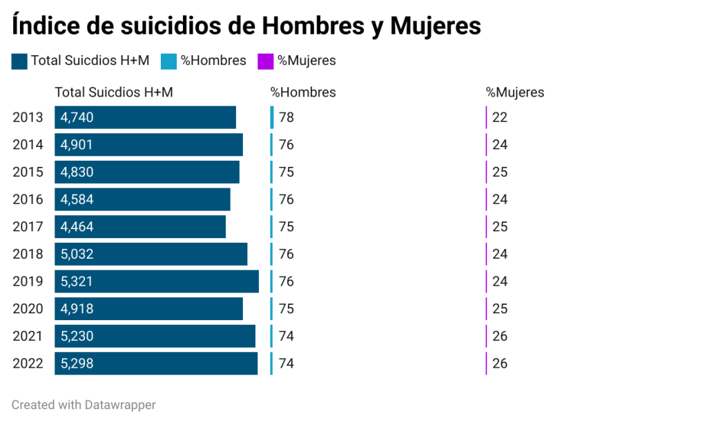 Puestos a cocinar, cocinemos todos ¿No? Primeramente, echemos un vistazo al total de fallecidos por suicido y comparemos el porcentaje entre hombres y mujeres. Las cifras son bastante llamativas entre sí.