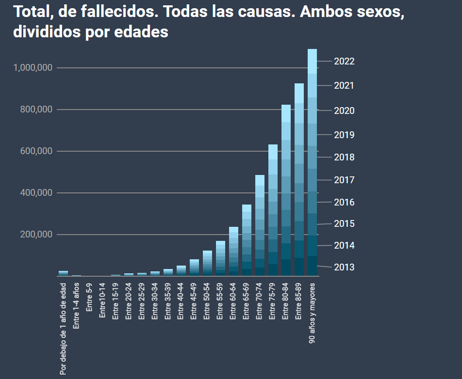 El porcentaje de hombres y mujeres fallecidos entre 2013-2022 no es una diferencia abismal. De hecho, sale una media del 50% entre ambos sexos, quedando la cosa en tablas. También se puede observar que el año de máxima mortalidad en ambos sexos fue el año pandémico de 2020.